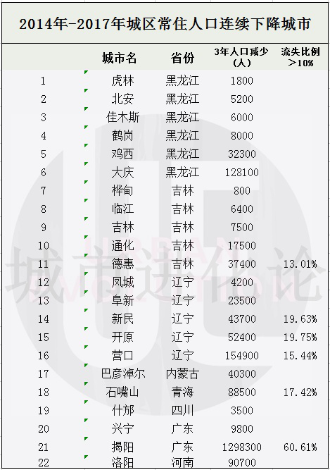 其中,有6座城市的城區(qū)常住人口三年流失率超過10%。只有位于東三省的12座“收縮型城市”,同步伴隨著人口密度連續(xù)三年下降。