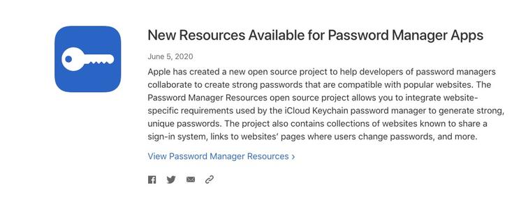 所謂的“密碼管理器資源”計(jì)劃是Apple的幾個(gè)開源項(xiàng)目之一,該計(jì)劃允許密碼管理器應(yīng)用程序?qū)Cloud Keychain密碼管理器使用的網(wǎng)站的特定要求集成到自己的應(yīng)用程序中。Apple的目標(biāo)是允許加密應(yīng)用程序開發(fā)人員在開發(fā)資源上進(jìn)行協(xié)作,以提高質(zhì)量,記錄特定于站點(diǎn)的行為并提高用戶信任度。