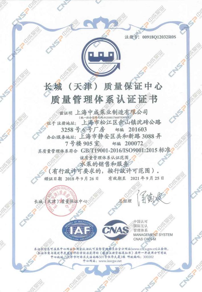 中成泵業(yè)作為一家獨(dú)立成熟完整的企業(yè),以自吸泵為主打系列,經(jīng)過(guò)長(zhǎng)城質(zhì)量保證中心各位專(zhuān)家的審核,滿(mǎn)足GB/T19001:2015質(zhì)量管理體系標(biāo)準(zhǔn)要求,于2018年9月26日頒發(fā)證書(shū)。