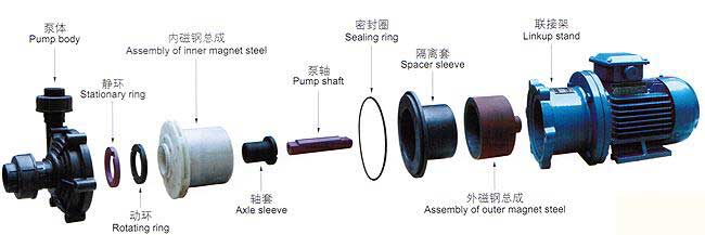 關(guān)于磁力泵構(gòu)造圖,現(xiàn)存的不銹鋼磁力泵大多是由電動機(jī)、磁力偶合器、離心泵這三個(gè)部件組成,因型號的不同在內(nèi)部結(jié)構(gòu)上有所差別,以區(qū)分不同的適用場景,但整體而言還是被用于運(yùn)輸各種不能泄露的酸堿毒性液體,而在此基礎(chǔ)上,為處理各種復(fù)雜介質(zhì)衍生出高溫型、自吸式、耐腐蝕性、小微型等等多種磁力泵。